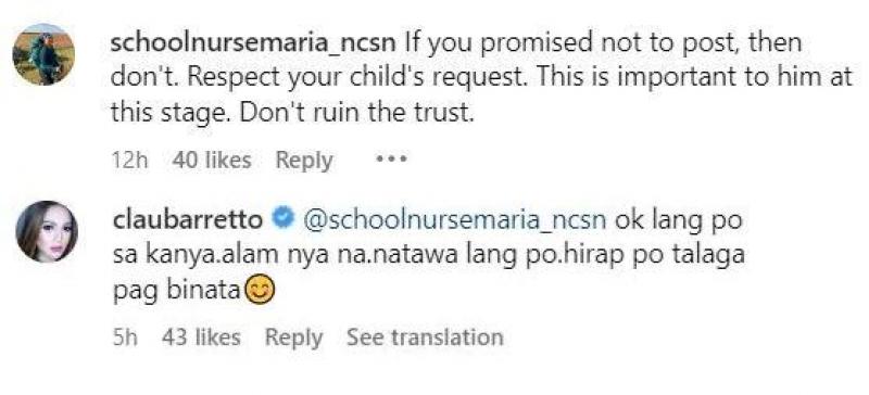 Claudine Barretto answers a comment telling her to respect her child's request.