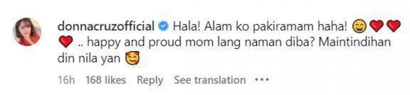 Fellow celebrity Donna Cruz shared sentiments with Claudine on her comment, “Hala! Alam ko pakiramam haha!️...happy and proud mom lang naman diba? Maintindihan din nila yan.”