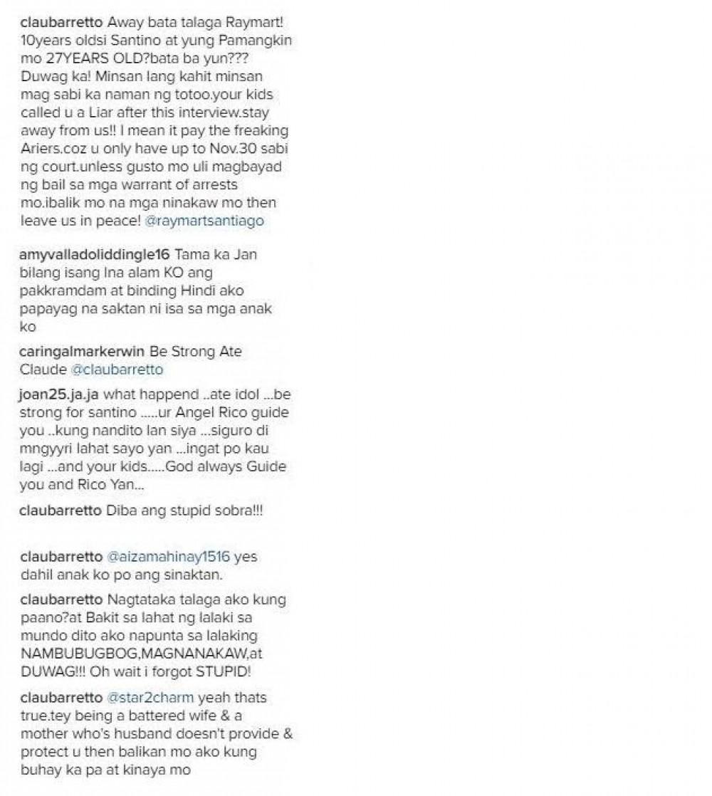 Sunod-sunod naman ang naging post ni Claudine sa Instagram at hiniling na magsabi ng totoo si Raymart. Nabanggit din ng aktres sa kaniyang series of posts ang pagiging battered wife at hindi diumano pagbibigay ng sustento ng kaniyang estranged husband.