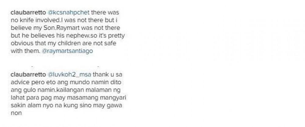 Pinabulaanan din ni Claudine ang naging pahayag ni Raymart na mambabato raw ng kutsilyo si Santino kaya raw ito pinigilan ng mga kamag-anak niya.
