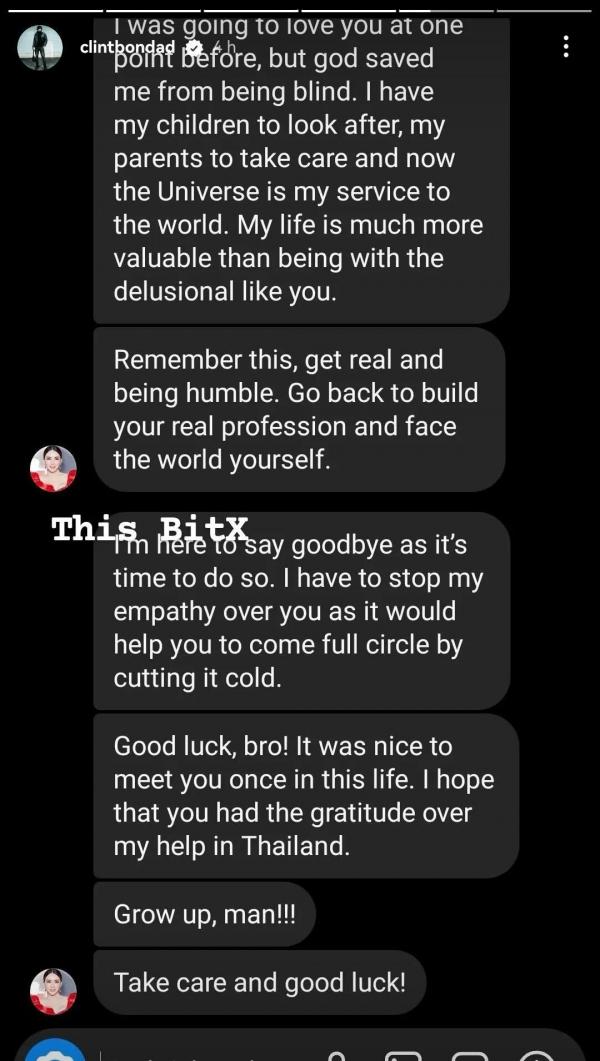 It looks like JKN Global Group and Miss Universe owner Anne Jakrajutatip is getting more of her personal business exposed to the public as model Clint Bondad has just shared some of the messages she's sent to him on his social media.