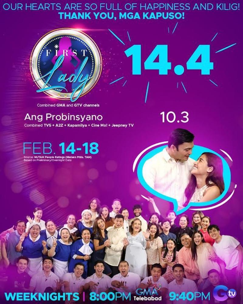 Ayon sa NUTAM People Ratings, ang average combined ratings ng First Lady sa pilot week nito ay 14.4%, mas mataas kumpara sa nakuha ng katapat nito na 10.3%.