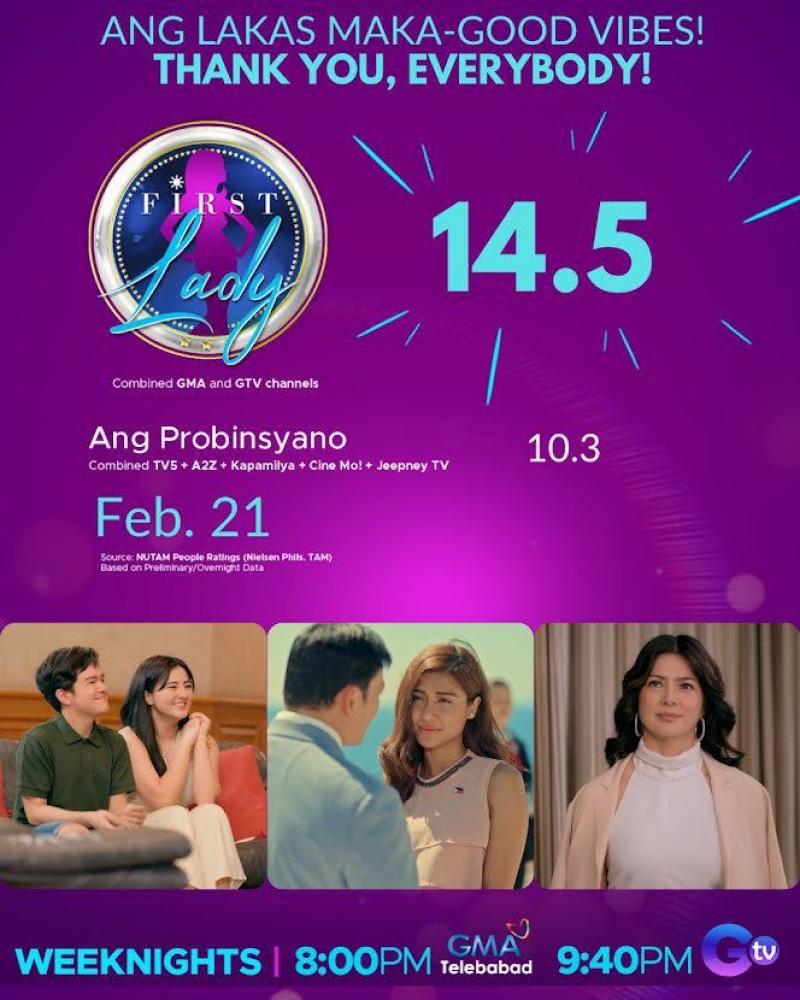 Sa episode kagabi, February 21, kung saan unang napanood ang batikang aktres na si Alice Dixson bilang si Ingrid Domingo, nagtala ang First Lady ng 14.5% combined ratings samantalang nakakuha lamang ng 10.3% ang katapat nito.