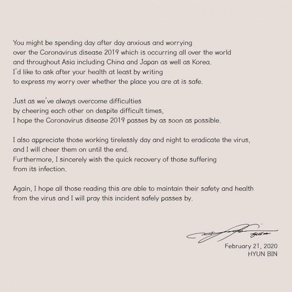 According to Hyun Bin's agency VAST Entertainment, the actor penned this letter showing support for everyone fighting COVID-19 epidemic.