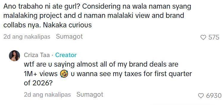 Without batting an eyelash, Criza responded in the comments section, saying she could even show her taxes for the first quarter of 2026 to prove she has the means.