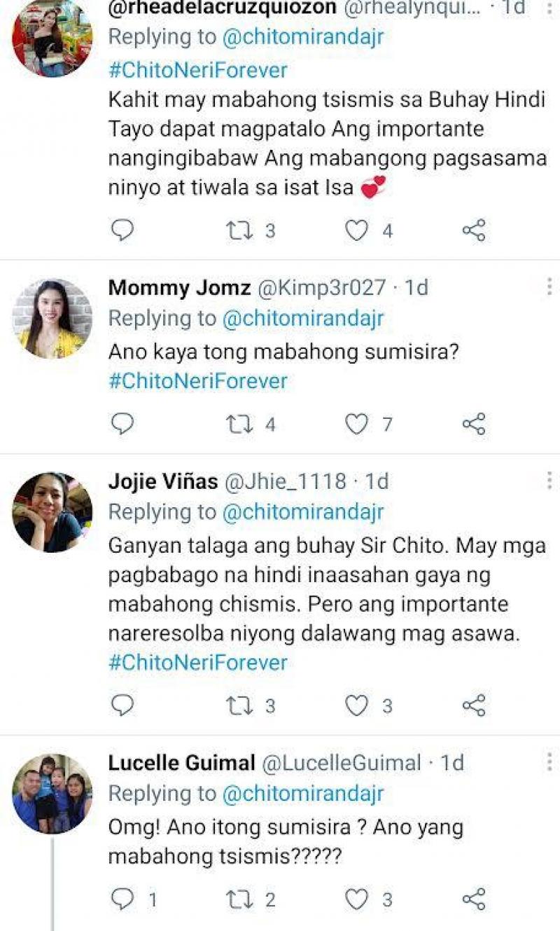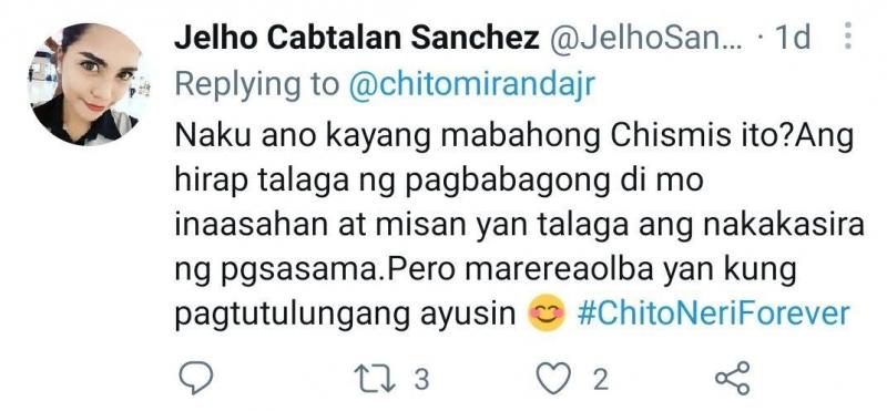 “Naku ano kayang mabahong chismis ito? Ang hirap talaga ng pagbabagong di mo inaasahan at minsan yan talaga ang nakakasira ng pagsasama. Pero mareresolba yan kung pagtutulungang ayusin #ChitoNeriForever,” ani ng isang @JelhoSanchez.