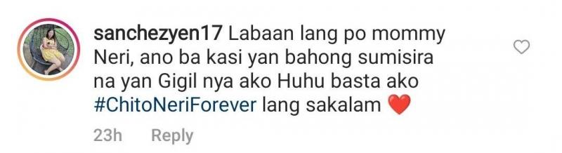 Ayon sa isang fan na si @sanchezyen17, “Laban lang po mommy Neri, ano ba kasi yan bahong sumisira na yan. Gigil nya ako huhu. Basta alam ako #ChitoNeriForever lang sakalam.”