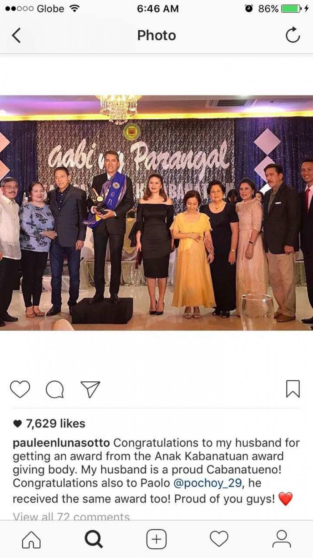 In an Instagram post of Pauleen Luna, she greeted her husband Vic for his latest recognition.