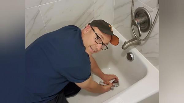Rob demonstrating how to unclog a bathtub drain | Source: Dad, how do I? (YouTube)