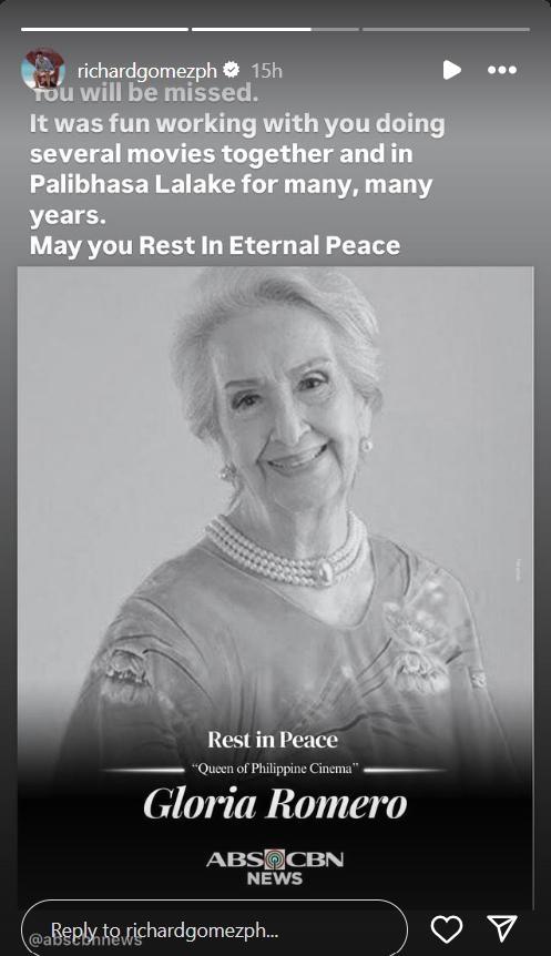 Gloria Romero's co-stars from long-running sitcom Palibhasa Lalake, Amy Perez and Richard Gomez, also expressed their condolences online. It's Showtime host Amy Perez uploaded a Reel of her with the esteemed actress, with the accompanying music being “Special Memory” by The Company. In the caption to the post, Amy wrote that she will miss Gloria Romero and that she would love her forever.