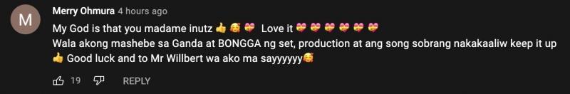 Sabi ni Merry Ohmura, “My God is that you madame inutz Love it (heart emoji). Wala akong mashebe sa Ganda at BONGGA ng set, production at ang song sobrang nakakaaliw keep it up.” Pinuri rin nito ang manager ni Madam Inutz.