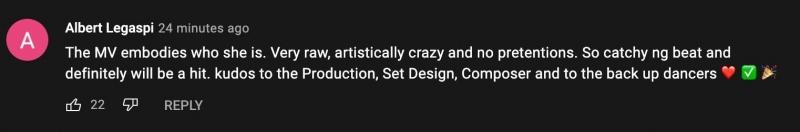 Ito naman ang masasabi ni Albert Legaspi: “The MV embodies who she is. Very raw, artistically crazy and no pretentions. So catchy ng beat and definitely will be a hit. kudos to the Production, Set Design, Composer and to the back up dancers.”