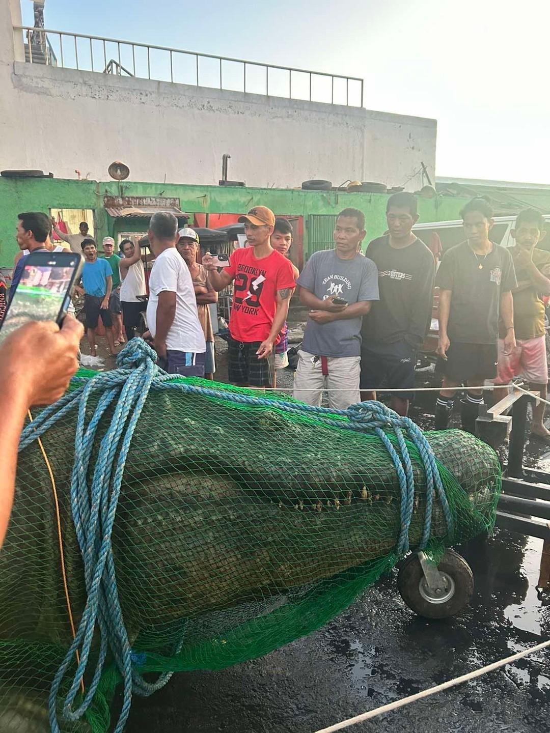 Pinagkaguluhan ang buwaya na nakatali at nakasilid sa netting para hindi makatakas.