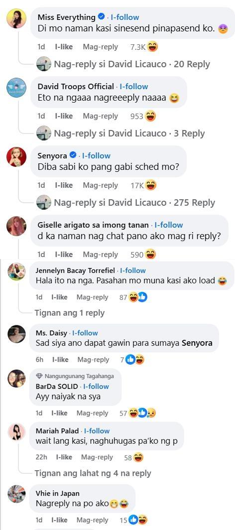 Comments on the post include netizens playfully teasing David with equally flirtatious lines. Some of the netizens even joked that David hasn't been messaging them so why should they reply back. Others joked that David should send them load first before they reply.