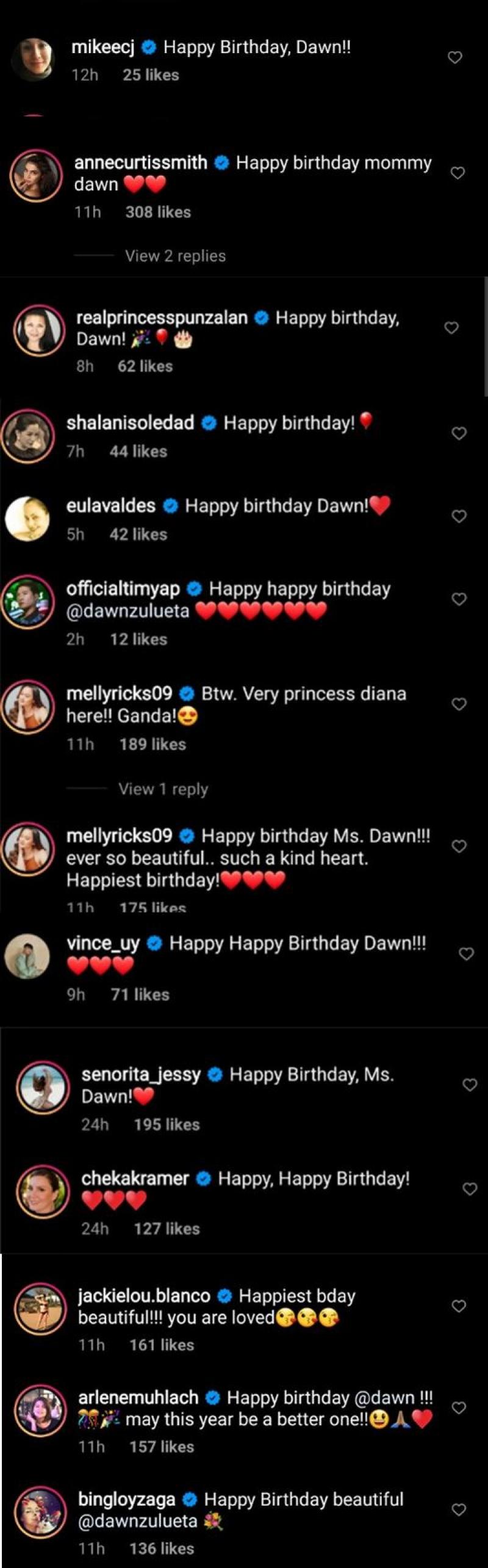 Several big names in show business also greeted Dawn Zulueta on he special day including Anne Curtis Mikee Cojuangco-Jaworski, Eula Valdes and Owe My Love star Jackie Lou Blanco.