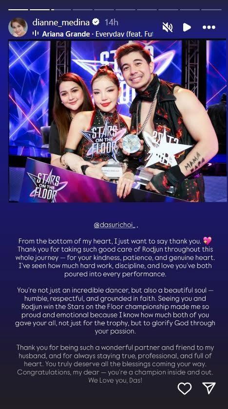 Dianne Medina is one proud and supportive wife, as her husband, Rodjun Cruz, recently won the ultimate dance star duo title on Stars on the Floor alongside Dasuri Choi.