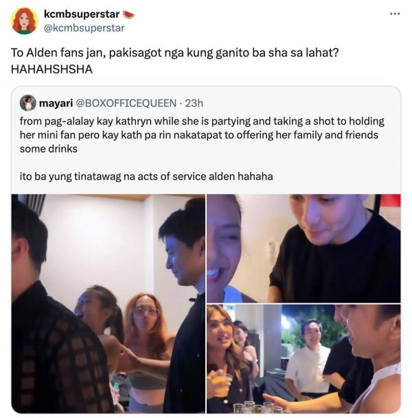 An X thread about Alden's schedule started when one user quoted a post that showed his extreme gentlemanliness. It said: “[F]rom pag-alalay kay [K]athryn while she is partying and taking a shot to holding her mini fan pero kay [K]ath pa rin nakatapat to offering her family and friends some drinks-- ito ba 'yung tinatawag na acts of service, [A]lden[?]”