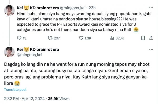 One user replied: “Hindi… [A]lam niyo bang may awarding dapat siyang pupuntahan kagabi kaya 'di kami umasa na nandoon siya sa house blessing? He was expected to grace the PH Esports Award kasi nominated siya for [three] categories pero he's not there [kasi] nandoon siya sa bahay nina Kath.”
