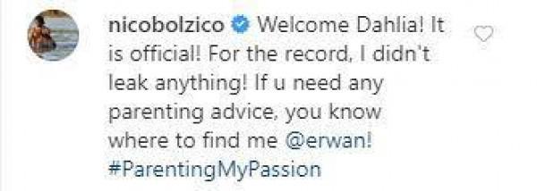 Nico wrote, “Welcome Dahlia! It is official! For the record, I didn't leak anything!