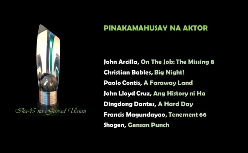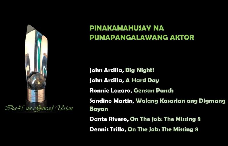 Meanwhile, Dennis Trillo was nominated for Pinaka mahusay na Pumapangalawang Aktor or the Best Supporting Actor award for his film, On the Job: The Missing 8. He is joined by Dante Rivero for the same film, Ronnie Lazaro for his movie Gensan Punch, and Sandino Martin for his film Walang Kasarian ang Digmaang Bayan.