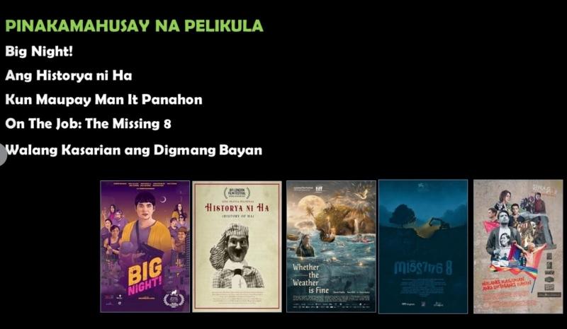 Meanwhile, several films in which Kapuso artists are a part of were also nominated for Pinaka Mahusay na Pelikula or the Best Film Award. This includes Dennis's On the Job: The Missing 8, John Lloyd's Ang Historya ni Ha, and Eugene's Big Night!