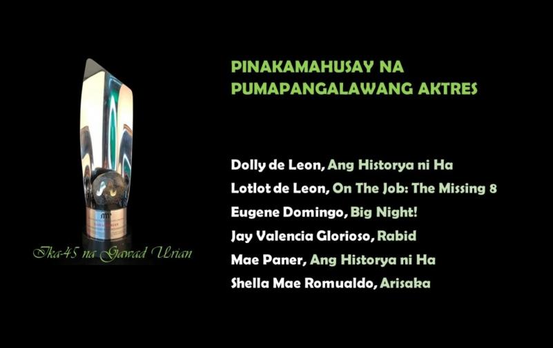 Eugene Domingo also earned a nomination for Pinaka mahusay na Pumapangalawang Aktres or Best Supporting Actress award for her film Big Night! Other nominees include Shella Mae Romualdo for her film Arisaka, Mae Paner for Ang History ni Ha, and Dolly de Leon for Ang History ni Ha, among others.