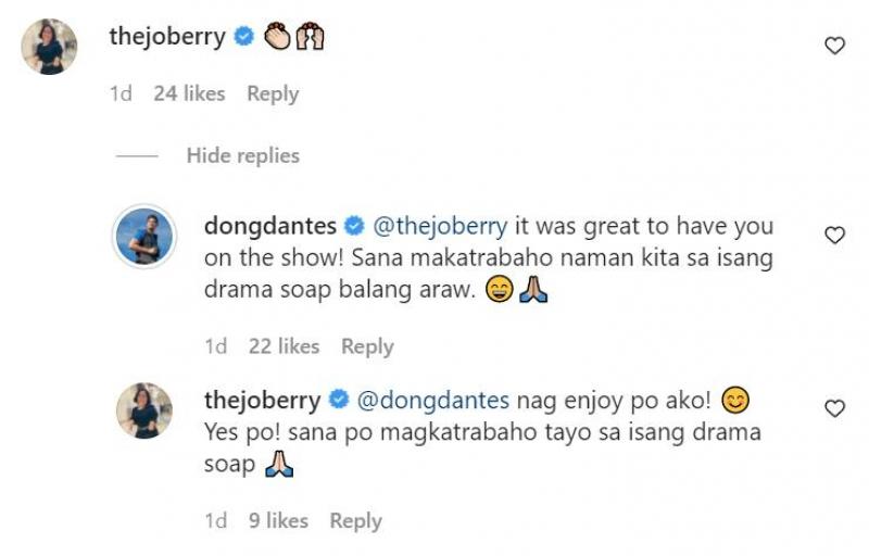 Dingdong told Jo with smiling face and praying hands emojis, "It was great to have you on the show! Sana makatrabaho naman kita sa isang drama soap balang araw."