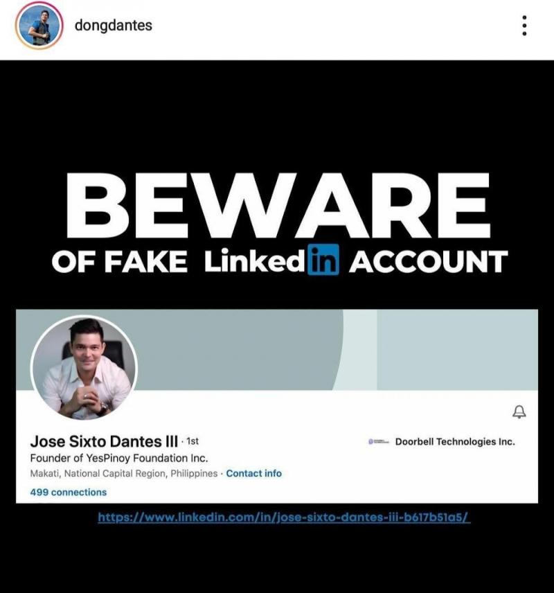 In an Instagram post, the Kapuso Primetime King shared a screenshot of the said account with a message above that reads: “BEWARE OF FAKE LinkedIn ACCOUNT.”