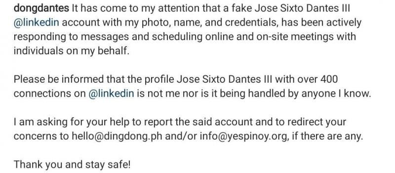 “Please be informed that the profile Jose Sixto Dantes III with over 400 connections on @linkedin is not me nor is being handled by anyone I know.”