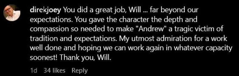 “You gave the character the depth and compassion so needed to make "Andrew" a tragic victim of tradition and expectations,” the director said.
