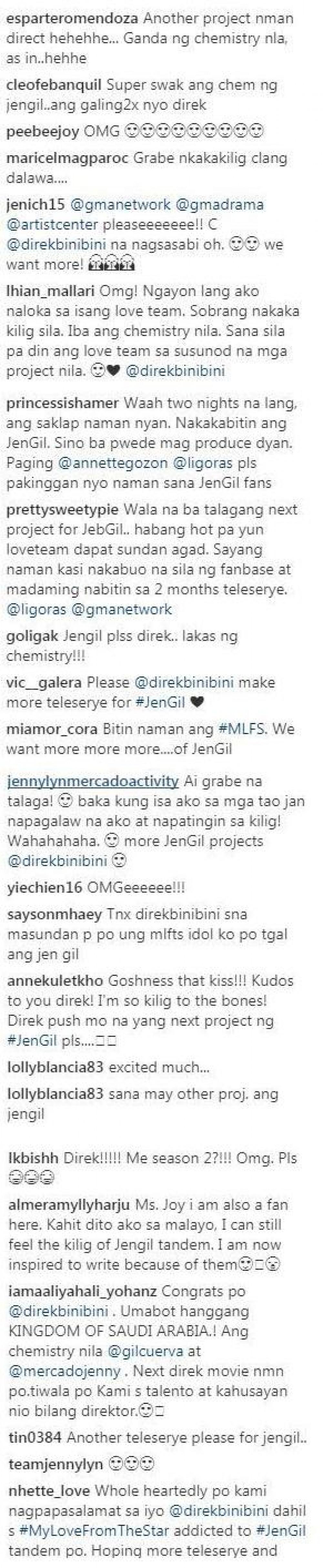 Bumuhos naman ang comments mula sa netizens. Ang iba ay nagpasalamat sa director sa magandang pagkakagawa ng Philippine adaptation ng My Love From The Star, samantalang ang iba naman ay humiling ng second project para sa JenGil.