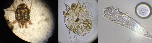 Ear mite, sarcoptic mite, and demodex mite | Source: @Joel Mills, @Kalumet, and @Blauerauerhahn~commonswiki (Wikipedia)