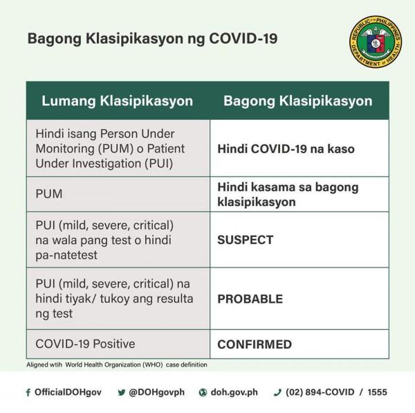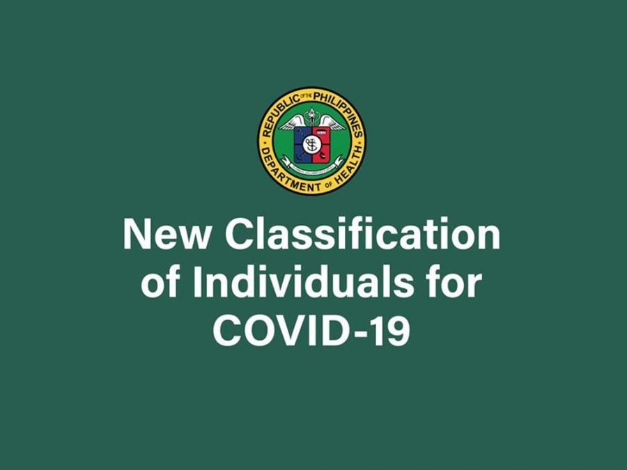 The Department of Health (DOH) introduced on April 11 the new classification of individuals with the Coronavirus Disease 2019 or COVID-19.