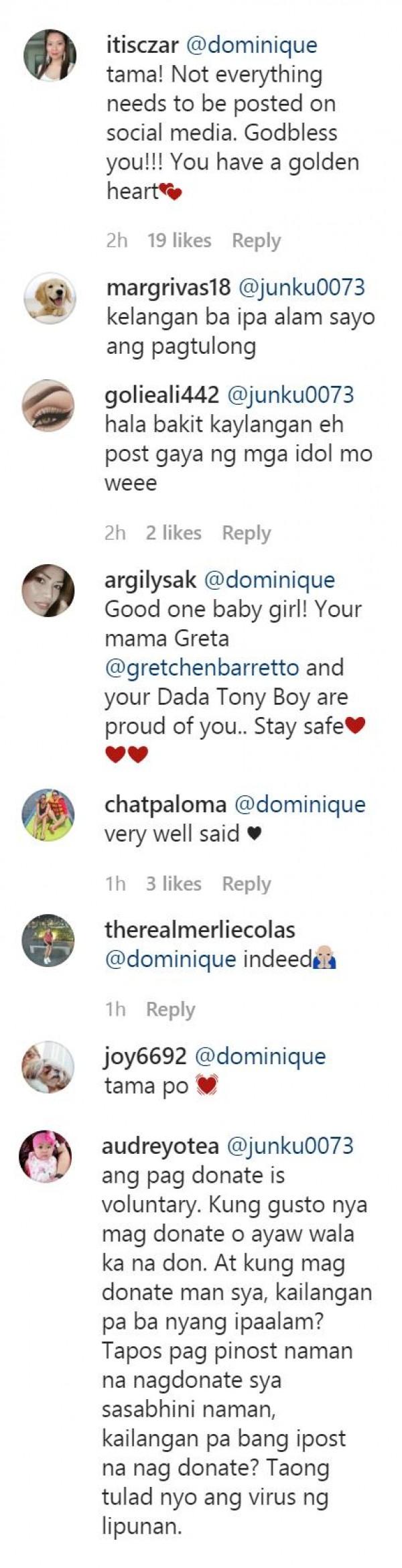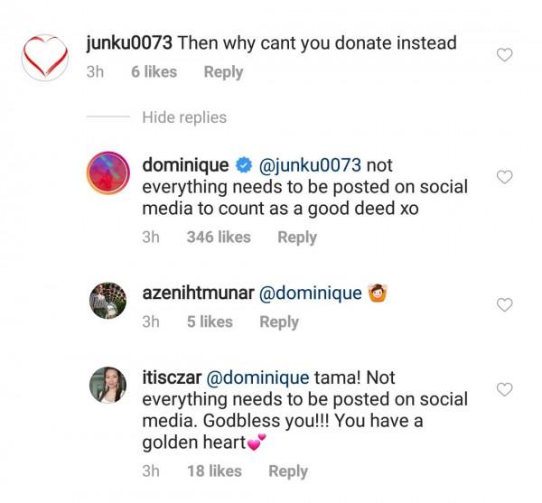 While her intention on the post was to give awareness about the situation of other during COVID-19 crisis, Dominique was not spared from a negative comment from a netizen asking her, "Then why cant you donate instead?"