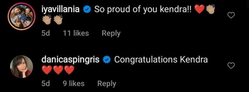 Mars Pa More host Iya Villania-Arellano and celebrity mom Danica Sotto-Pingris sent their congratulatory messages for Kendra in the comments section.