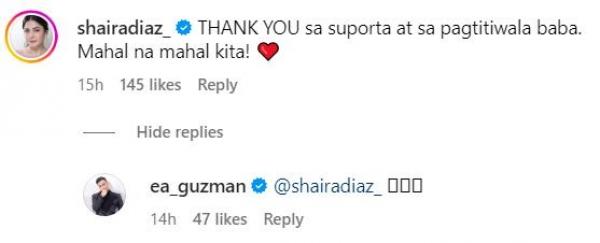 Napa-komento naman si Shaira sa sweet message ng kaniyang nobyo sa Instagram. Tugon niya, “THANK YOU sa suporta at sa pagtitiwala baba. Mahal na mahal kita!”