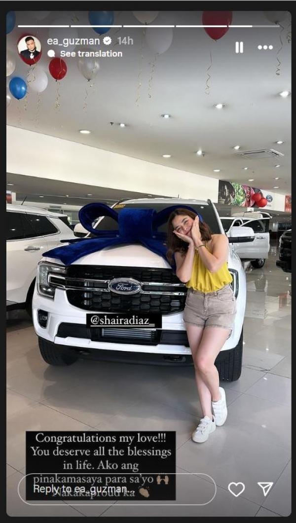 Samantala, sa Instagram ni EA, i-pinost niya ang larawan ni Shaira katabi ang bago nitong kotse na may kasama pang sweet message na, “Congratulations my love! You deserve all the blessings in life. Ako ang pinakamasaya para sa'yo. Nakakaproud ka.”
