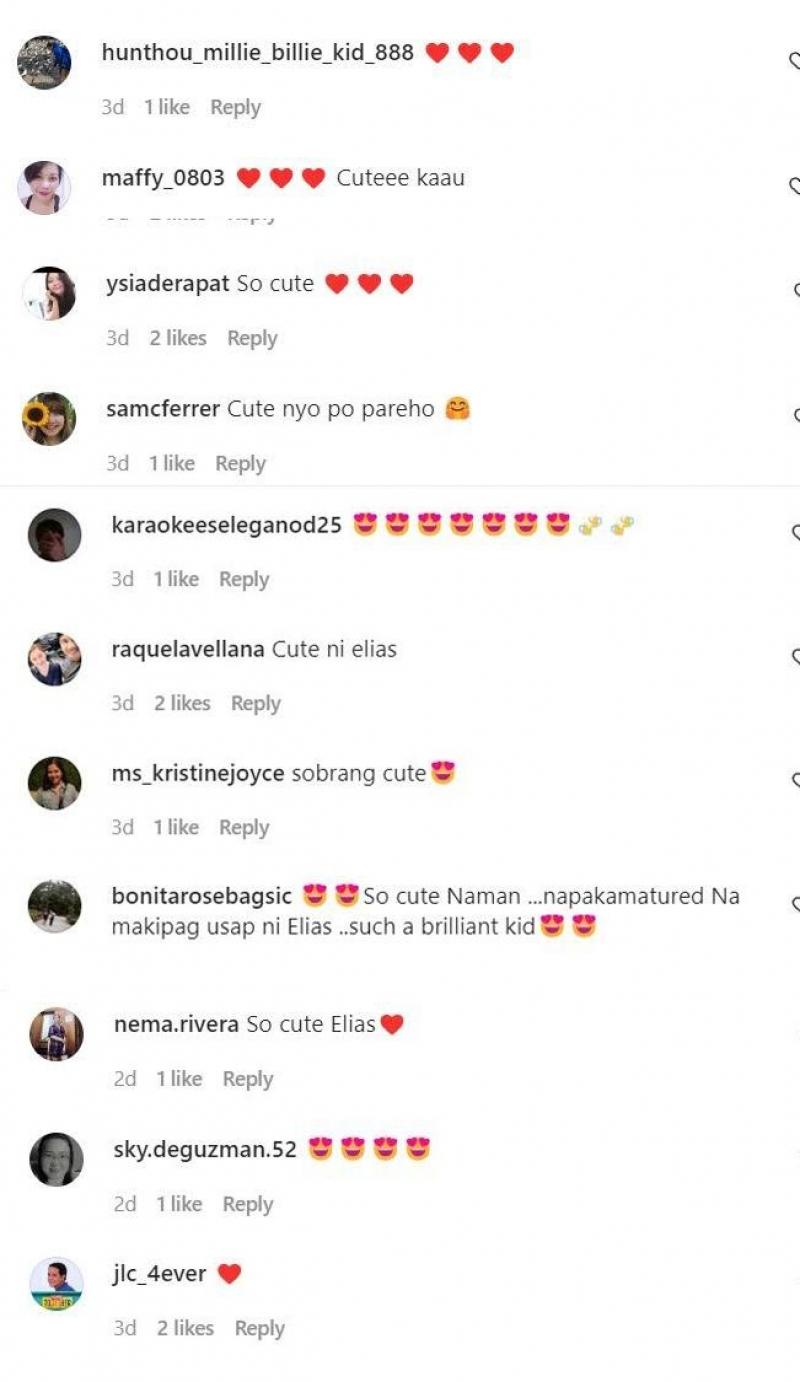 Several netizens reacted to her adorable video with Elias, like @bonitarosebagsic who commented, “So cute naman, napaka-matured na makipag usap ni Elias. Such a brilliant kid.”
