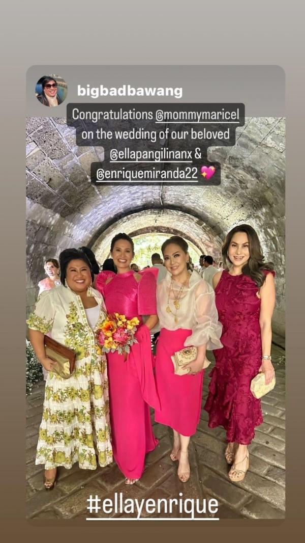 Maricel Laxa-Pangilinan, the mother of the bride, reposted the Instagram stories of actress and Viu Philippines' Head of Content Partnerships Garlic Garcia.