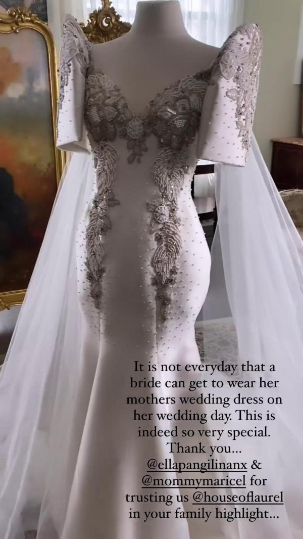 Ella's dress was created by internationally acclaimed Filipino fashion designer Rajo Laurel. According to reports, it was the same dress that Maricel wore on her wedding to Anthony Pangilinan.