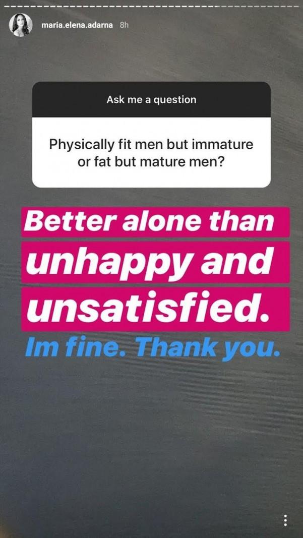 “[It's] better to be alone than unhappy and unsatisfied. I'm fine. Thank you,” sagot niya.