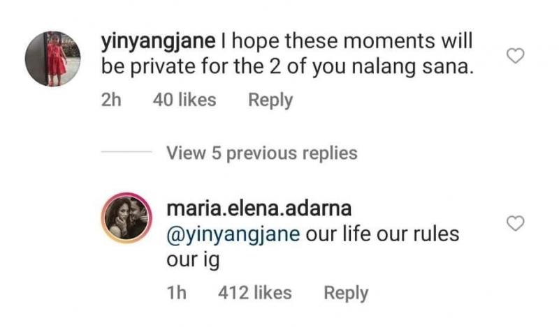"I hope these moments will be private for the 2 of you na lang sana," commented by a netizen who goes by the handle @yinyangjane.