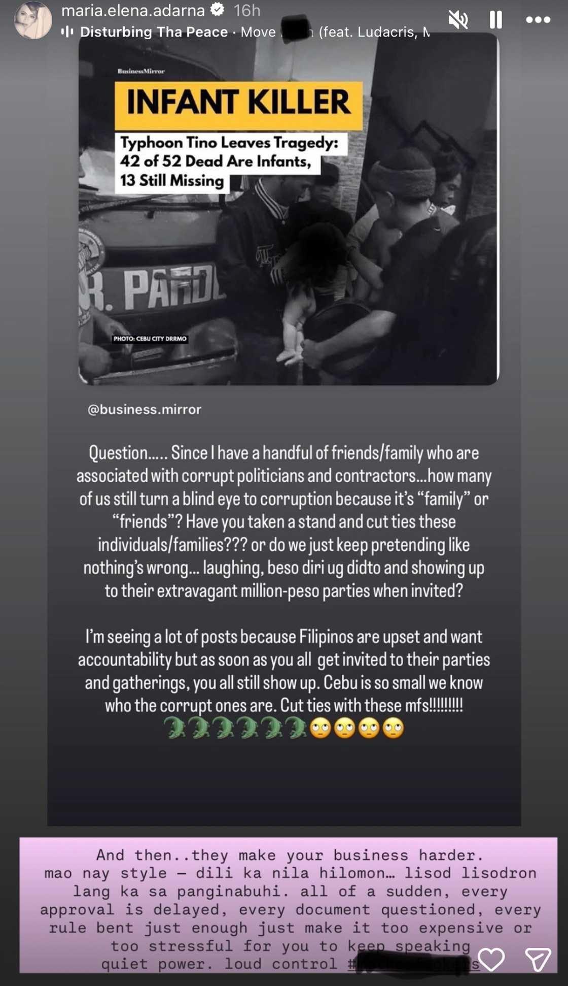 In her Instagram Story, Ellen stressed that her family and friends in Cebu should cut ties with corrupt politicians and contractors already.