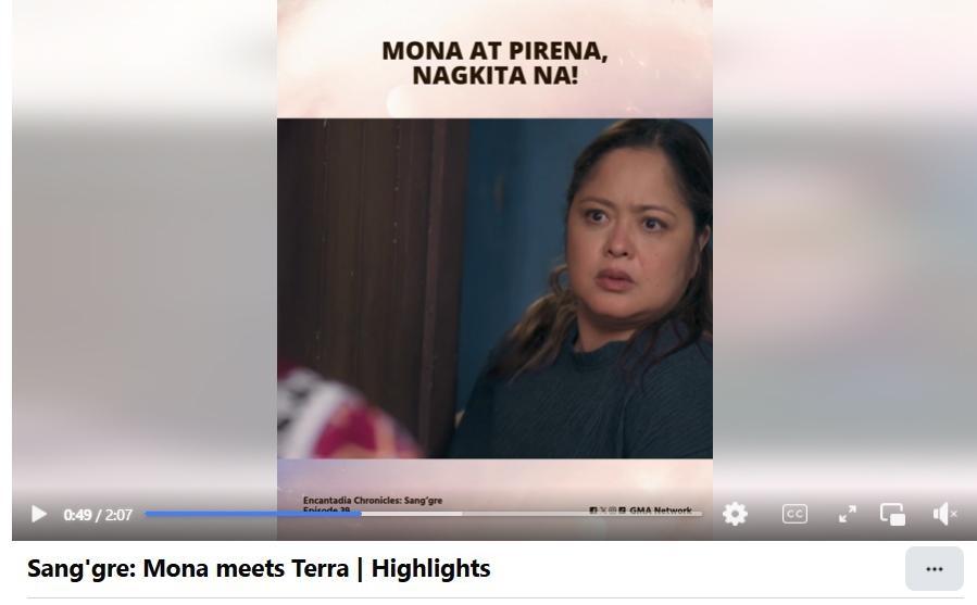 Ang naturang eksena ng pagkikita nina Sangˈgre Pirena at Mona, na ginagampanan ng versatile actress na si Manilyn Reynes, ay umani ng one million views sa Facebook in less than 24 hours.