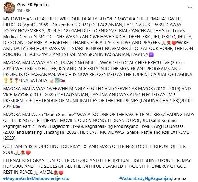 Former Laguna Governor and action star ER Ejercito announced heartbreaking news early Sunday morning, November 3, that his wife, former Pagsanjan Mayor Girlie “Maita” Javier-Ejercito (more popularly known as Maita Sanchez), passed away at the age of 55 due to endometrial cancer.