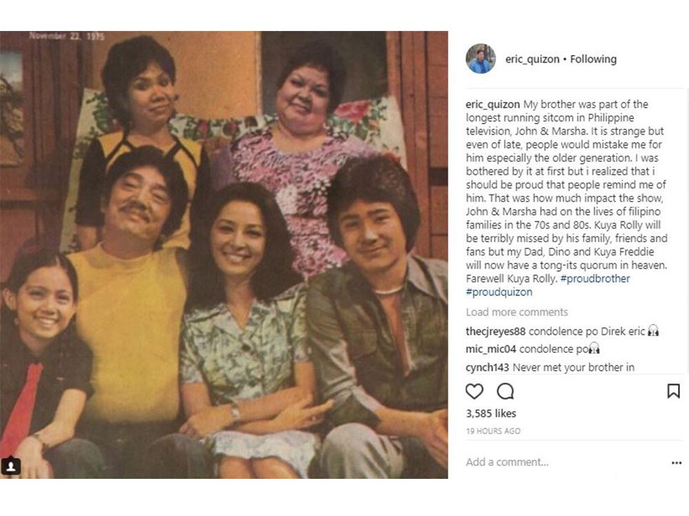 "Kuya Rolly will be terribly missed by his family, friends and fans but my Dad, Dino and Kuya Freddie will now have tong-its quorum in heaven. Farewell, Kuya Rolly. #proudbrother #proudquizon"
