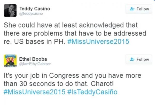 Sa interview, nabigyang liwanag ang isyu tungkol sa pagsagot ni Ethel kay Teddy Casino sa Twitter matapos punahin ng huli ang sagot ni Miss Universe 2015 Pia Wurtzbach ang question and answer portion sa kompetisyon.