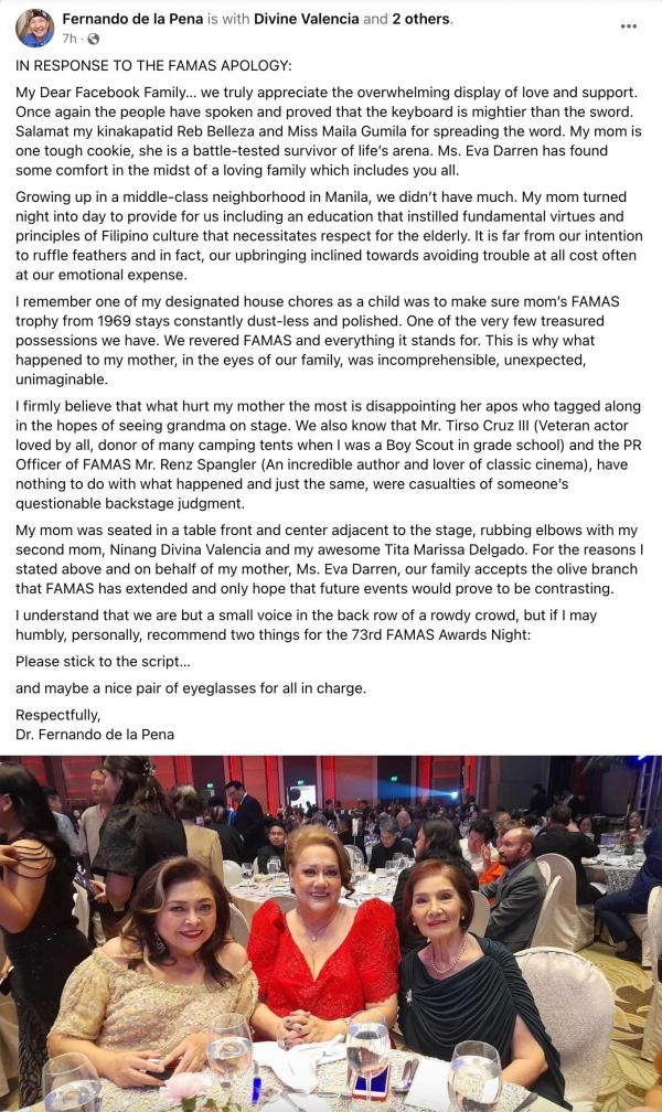 Veteran actress Eva Darren and her family have finally responded to the organizers' apology about the alleged disrespectful treatment on her at the recent 72nd Filipino Academy of Movie Arts and Sciences (FAMAS) Awards.