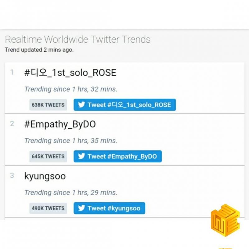 As of writing, the hashtags #디오_1st_solo_ROSE and #Empathy_ByDO, as well as D.O.'s real name "kyungsoo" are trending in Twitter worldwide.
