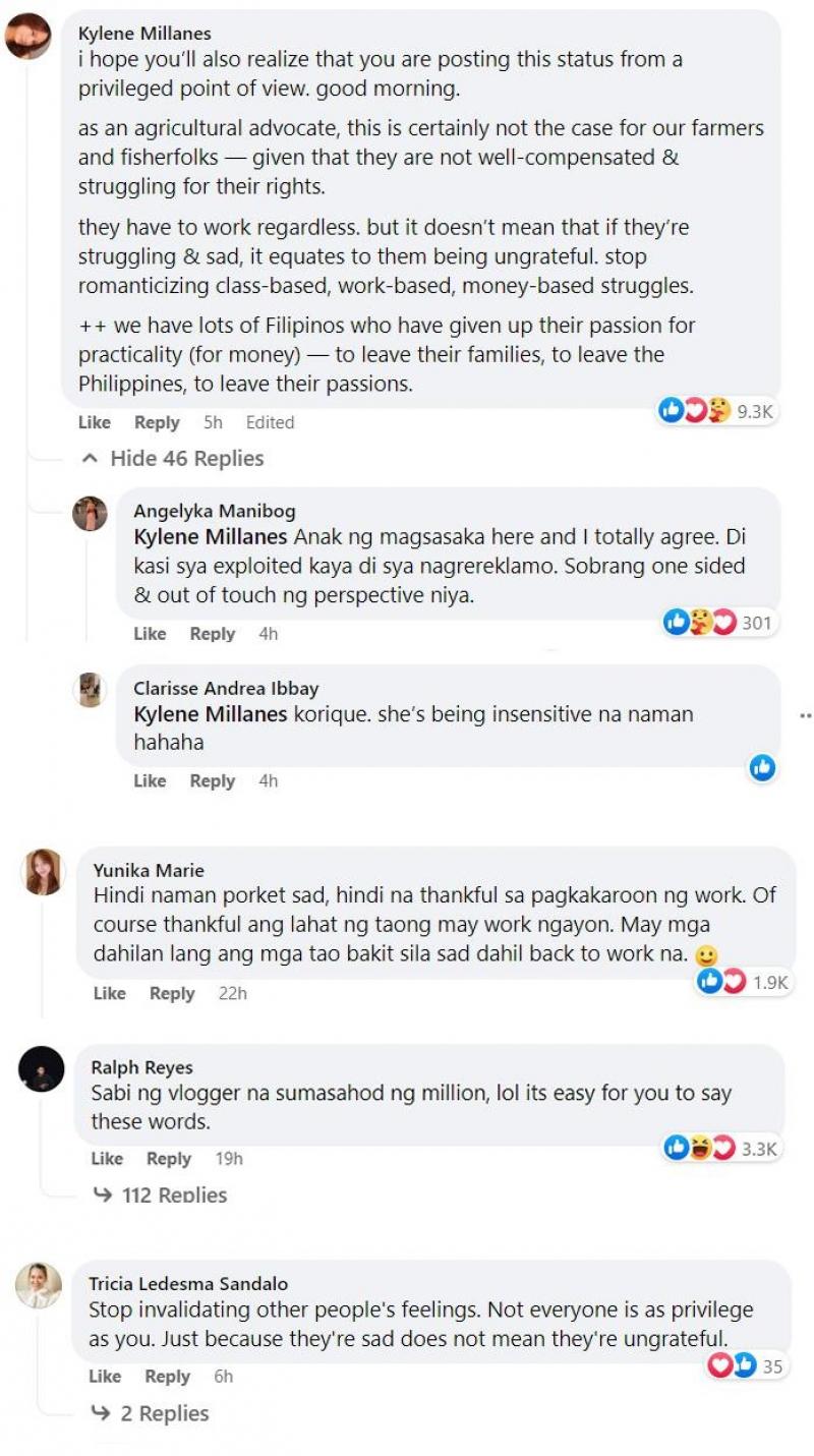 Komento ni Kylene Millanes, “I hope you'll also realize that you are posting this status from a privileged point of view. good morning."